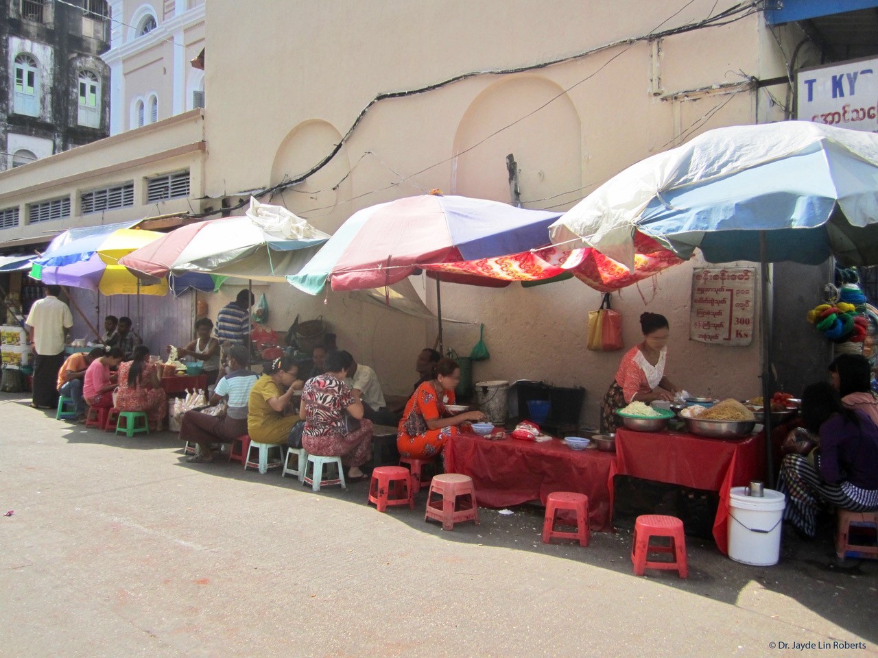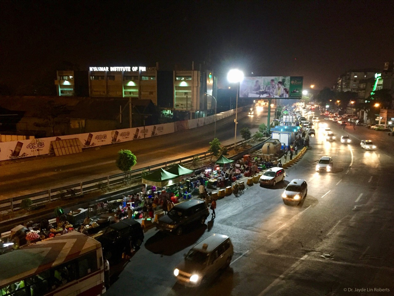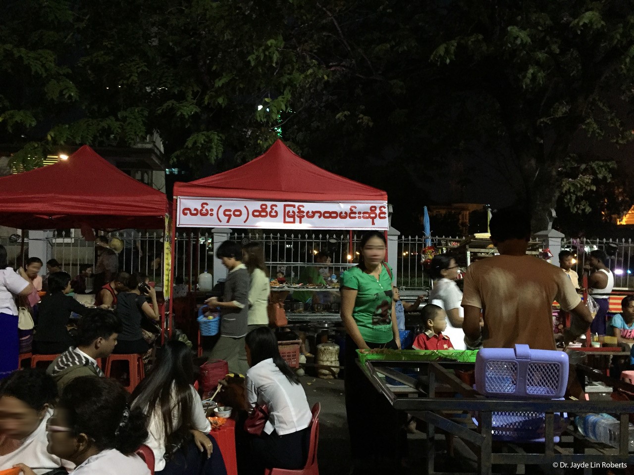 In 2015, the since toppled civilian-led government attempted to modernise and formalise street vending by establishing a completely new night market along a major arterial road in Yangon. Funded and supported by the Japan International Cooperation Agency (JICA), this car-dominated street was not pedestrianised, but vending spaces were marked out on the edge of the road using an unclear allocation system that accommodated less than half of the hawkers in the city. Vendors complained that poor hawkers were excluded and all were displaced, uprooting all sellers from long-established neighbourhood-based spatialities and ecologies of street vending. To maintain their place-based relational connections in the face of displacement, some vendors labelled their stalls according to the street or block they were once located, not only to maintain their previous customer base but also to identify themselves as belonging to that specific place.